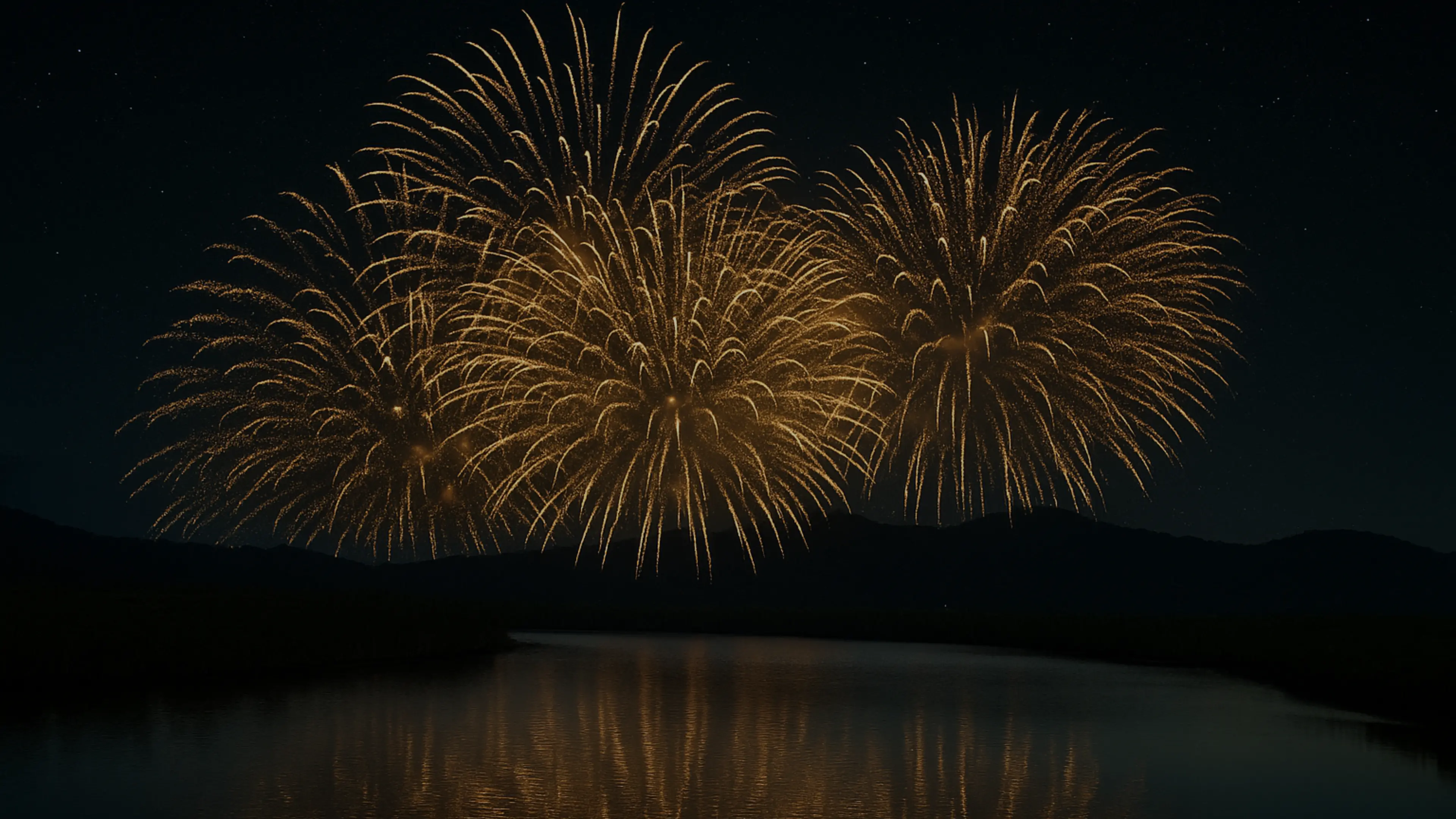 Queima de fogos sobre a água e celebração, tudo com segurança total